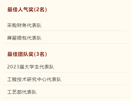 After fierce competition, the on-site judges carefully evaluated the participating teams through five aspects including artistic expression, action design, and clothing instrumentation. The final product manufacturing department team won the first prize with the highest score, the large workshop team, the human economy office equipment and The information department team won the second prize, the cutting workshop team, the electrical workshop team, the domestic trade and foreign trade operation and maintenance technology team won the third prize, and the small workshop team and the quality assurance department team won the best organization award, the purchasing finance team and the shielding spray bag team won the best popularity award, while the 2023 college student team, the engineering technology research center team and the technology department team won the best team award.