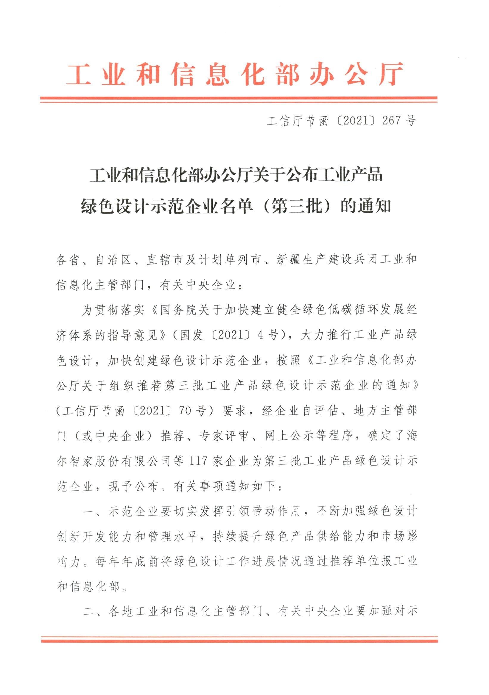 Jiadian Co., Ltd. actively strengthened the innovation and development ability and management level of green design, and continuously improved the supply capacity and market influence of green products. In November 2021, Jiadian Co., Ltd. was rated as a national "green product design demonstration enterprise" by the Ministry of industry and information technology, and became the only one selected as the third batch of industrial product green design demonstration enterprises in Heilongjiang Province.