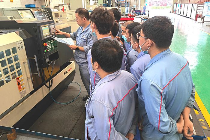 Wu xianwen, a technician of jiadian co., ltd. and a numerical control lathe worker in the shielding workshop, conducted practical training in front of the numerical control lathe on the basis of map recognition, tool selection, difference of coating materials for numerical control tools and cutting dosage, and analyzed and explained common problems in the operation process to promote the improvement of product quality and production efficiency.