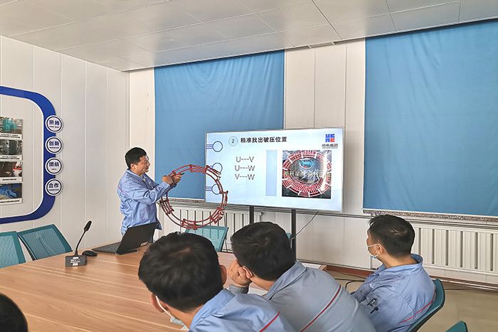 Cheng Mingkun, a senior technician of Jiadian Co., Ltd. and a wiring worker in the electrical workshop, explained in detail the importance of winding wiring and the drawing of regular three-phase wiring circle diagram to the employees with actual cases. Through the physical wiring materials made by himself, he shared in detail the tips for quickly finding the pressure breaking point. Only a multimeter and a broken wire cutter are needed, and the fault location can be quickly found through phase separation → grouping → separation.