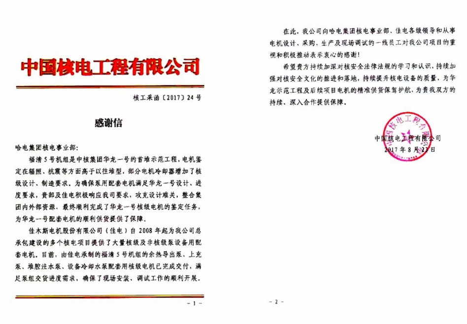 On August 23, 2017, China Nuclear Power Engineering Co., Ltd. sent a letter of thanks to the Nuclear Power Division of Harbin Electric Power Group, fully affirming that Jiadian Co., Ltd. guaranteed the motor appraisal and project implementation of Fuqing Unit 5 on schedule.