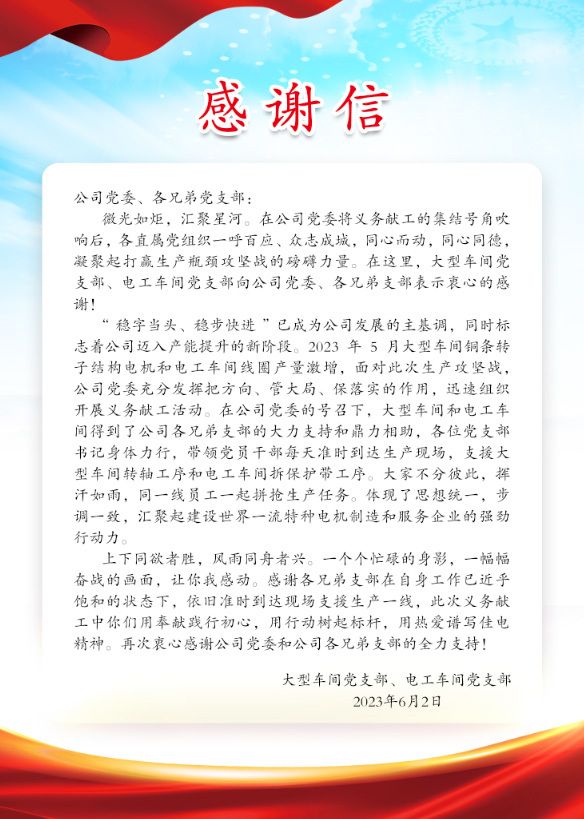 The development of the work dedication activities is not only a starting point for the Jiadian Party Committee to promote the theme education activities, but also a starting point for in-depth investigation and research work; it is not only a vivid practice of transforming the theme education learning results into service production, but also for the majority of party members and cadres. Xi Jinping's thoughts on socialism with Chinese characteristics in the new era are transformed into firm ideals, tempering party spirit, guiding practice, and promoting work. Through this voluntary contribution activity, it fully demonstrated the spirit of party members, cadres and employees of functional departments to overcome difficulties and forge ahead, enhanced the communication between technology, management, and production positions, and deepened the difficulties in the implementation of the production process. Understanding, to provide a solid practical basis and support for actual work. Recently, large-scale workshops and electrical workshops sent thank-you letters, expressing high recognition and deep gratitude to the party members, cadres and employees who participated in this voluntary work dedication activity.