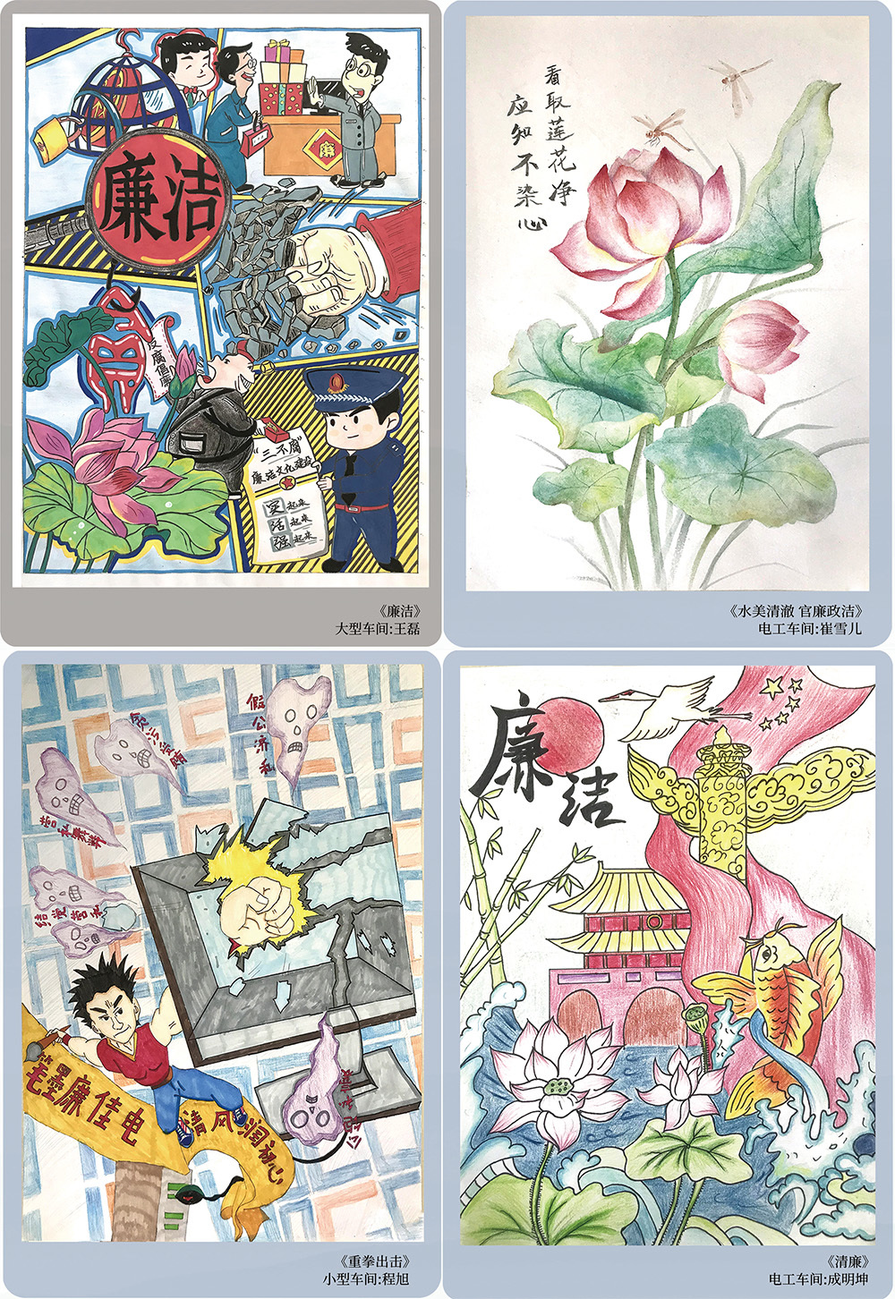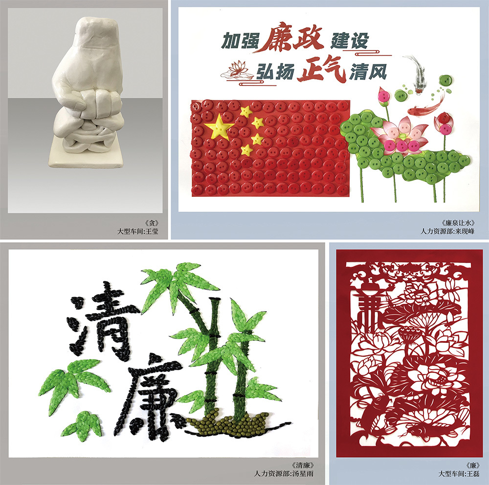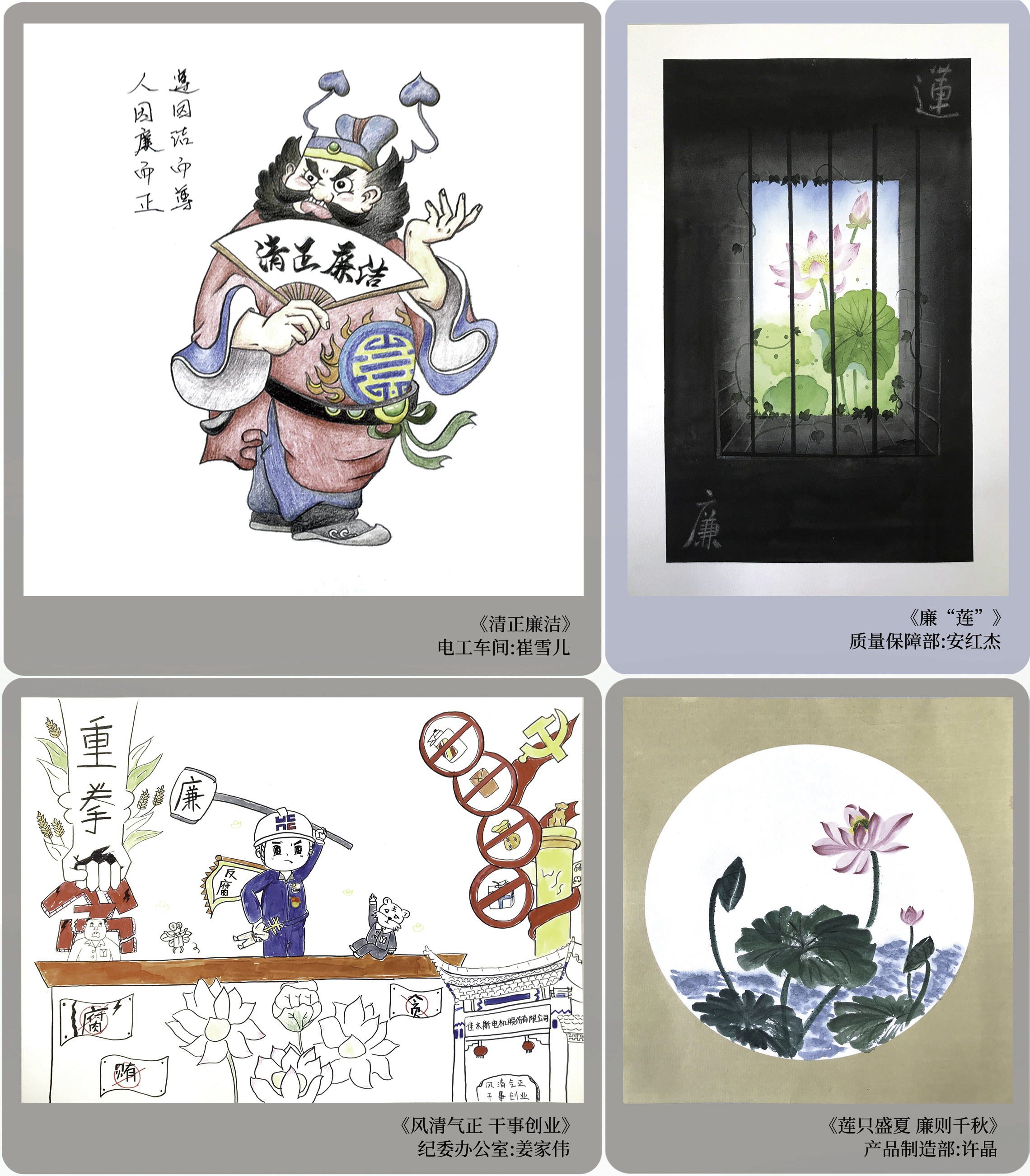书画言志,金石寄情。作品中既有以寓意廉洁高尚的“莲”“竹”为元素的绘画和幽默风趣、构思巧妙的漫画,以廉政诗词、格言警句为内容的书法作品,也有惊艳夺目、精美细腻的五谷粘贴手工艺品,还有通过职工视角、别具一格的构思,演绎拍摄出佳电廉洁文化故事。通过这些作品实现了廉洁文化与书画艺术充分融合,增强了廉洁文化教育的吸引力、说服力、感染力和穿透力,展现了佳电股份广大党员干部职工防微杜渐、廉洁从业的信心和决心。